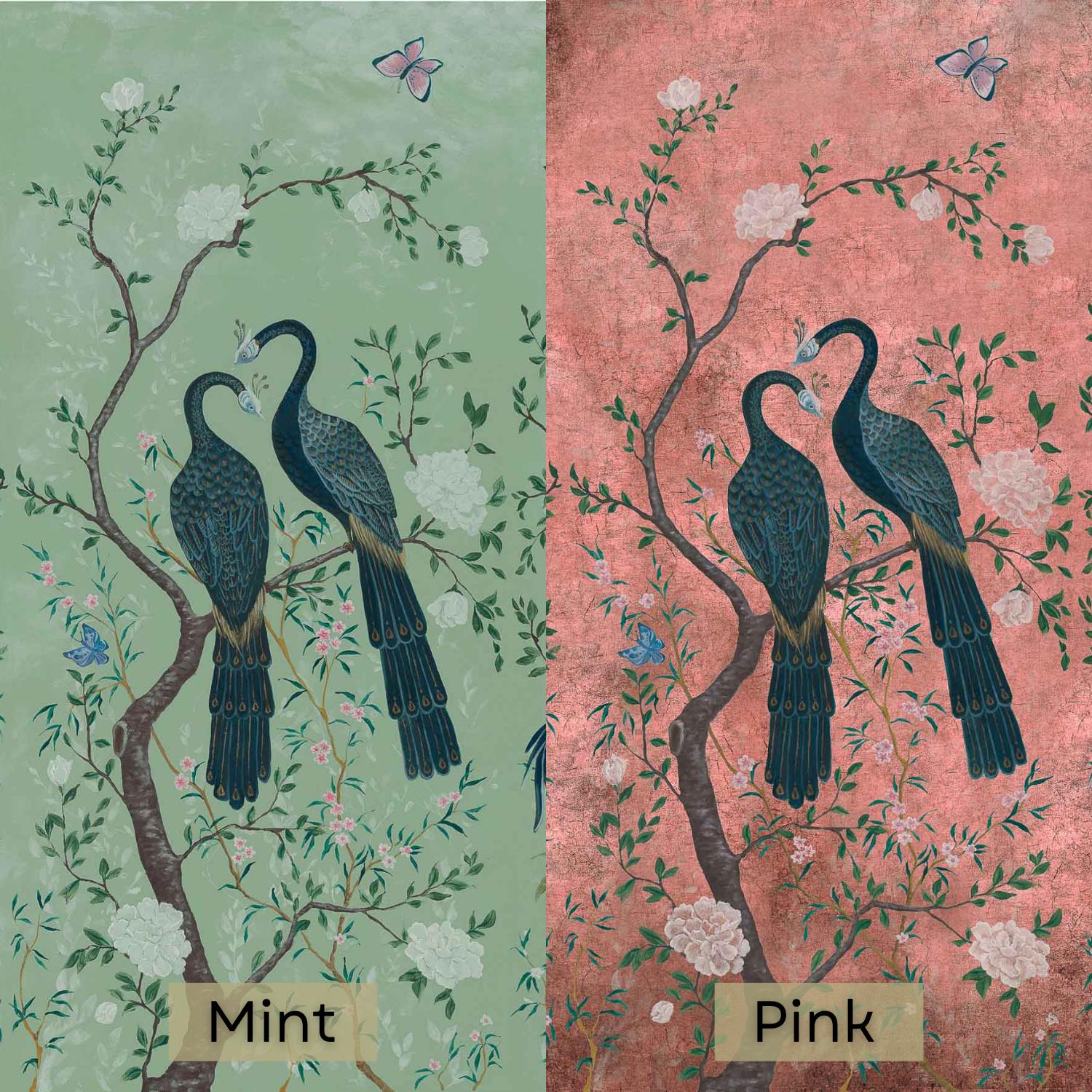 Give your interior a sense of elegance with this Golden Chinoiserie pattern, as delicate Blue Birds Peacocks recline between exquisite Flowering Trees. Inspired by traditional Japanese Wallpaper and rich Asian Inspired themes, this Chinoiserie Mural is a true expression of an Exotic Garden Scene.
