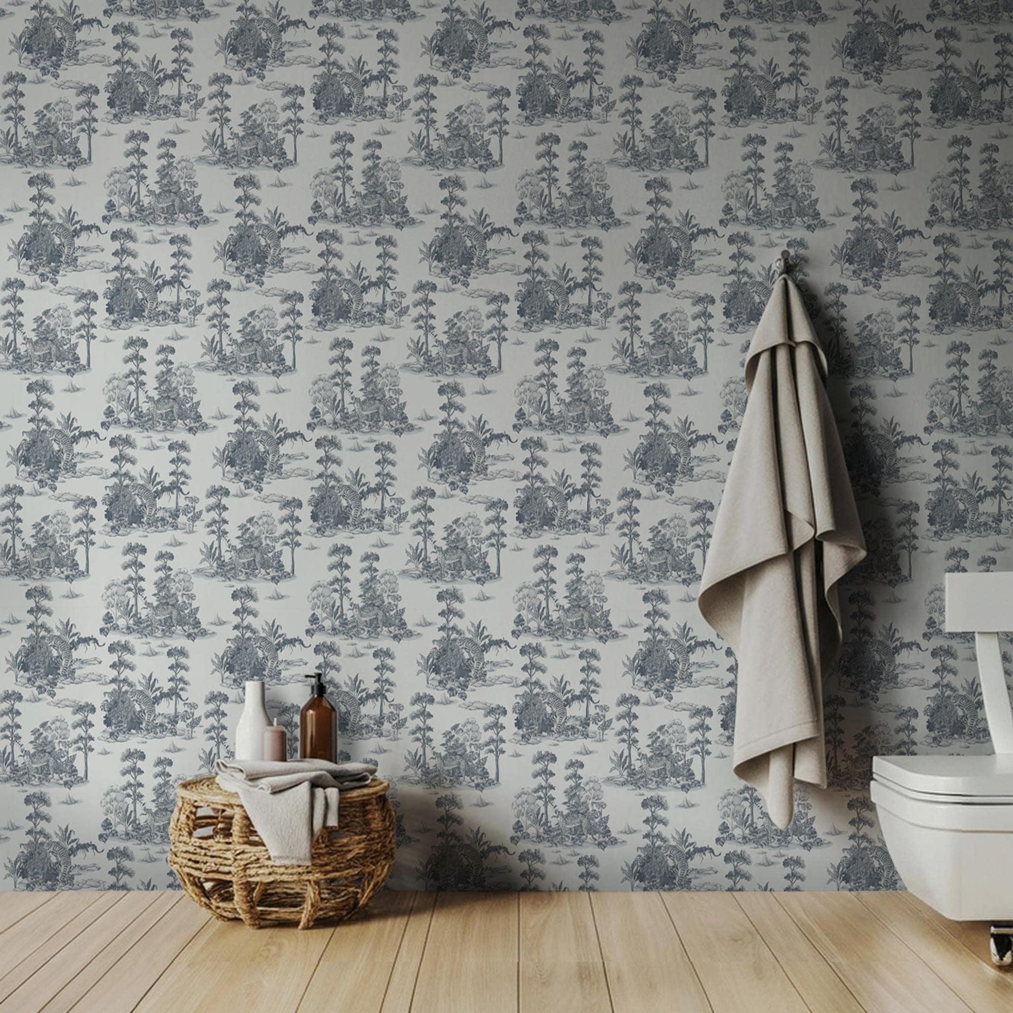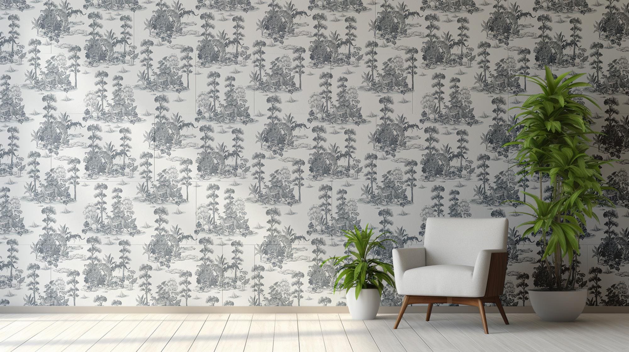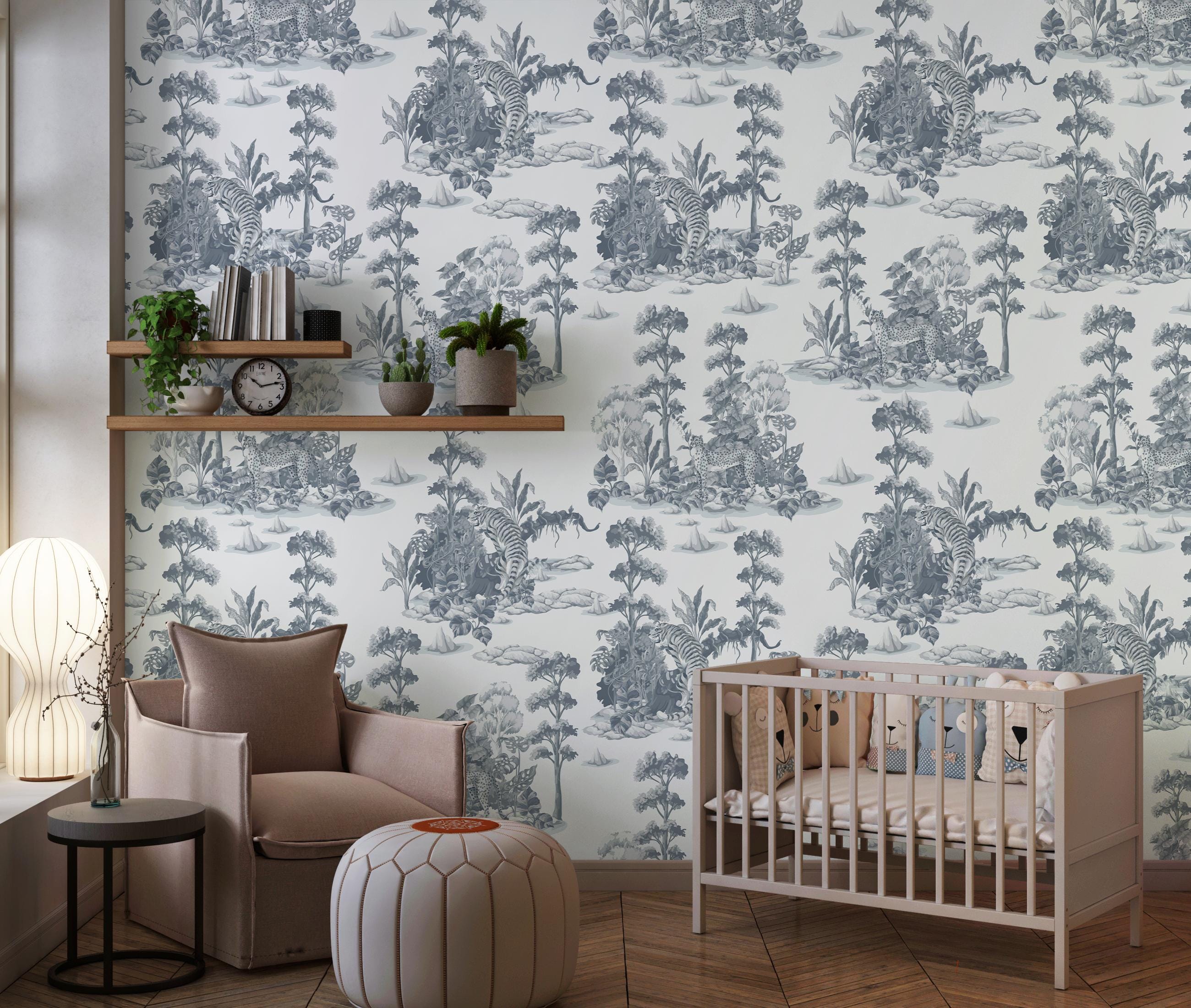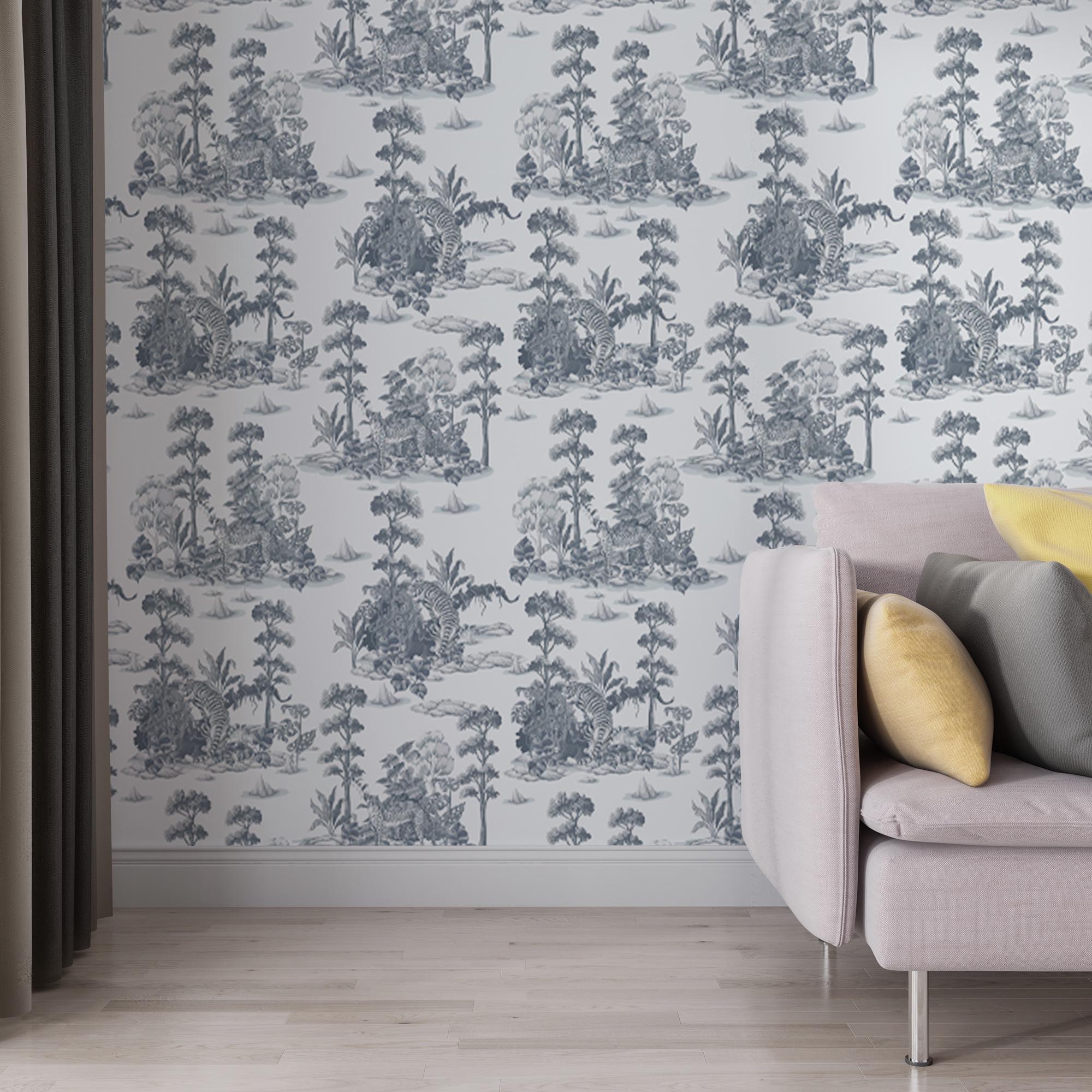 Gray Toile Jungle Wallpaper - Tigers and Leopards Tropical Forest Design Peel and Stick Mural
