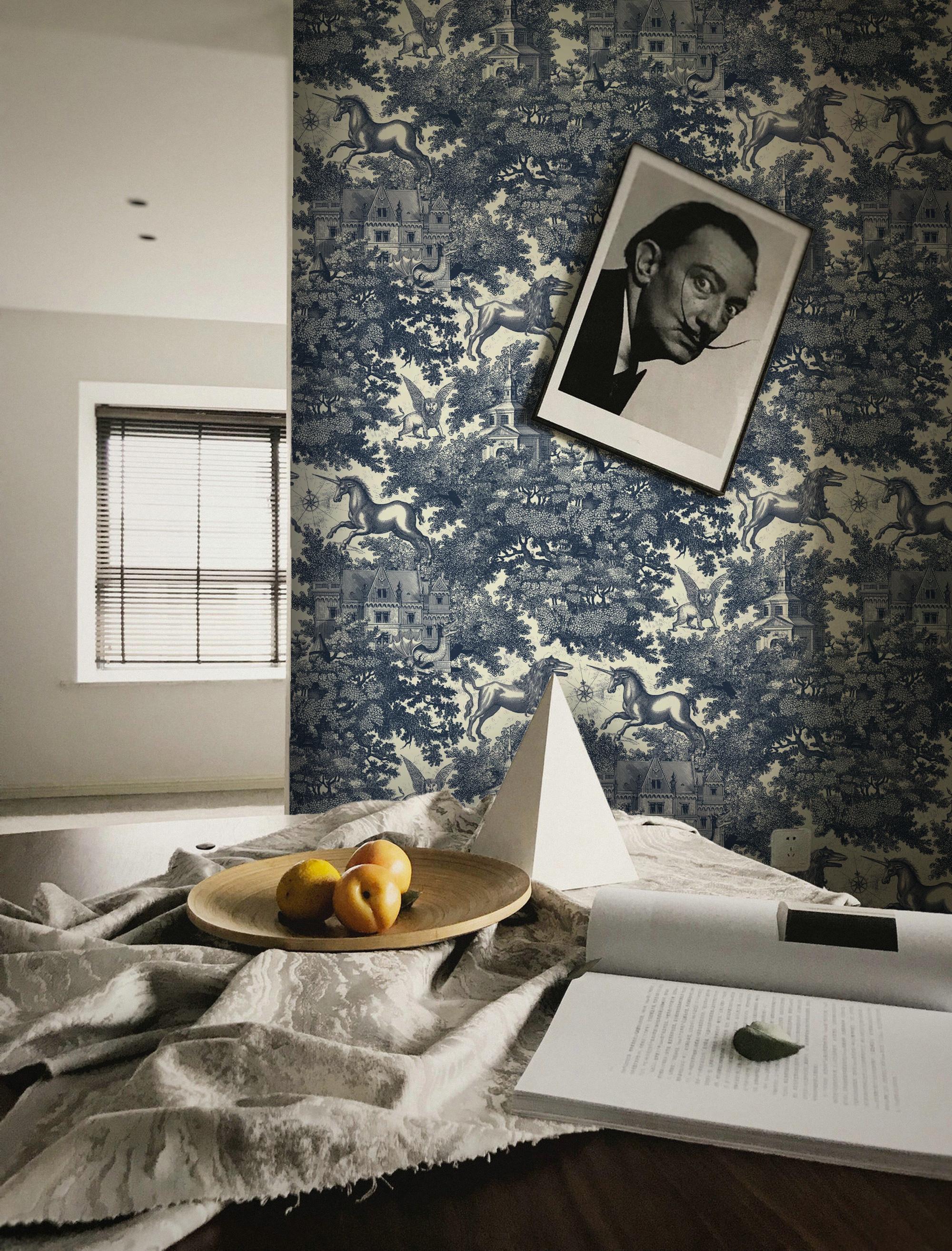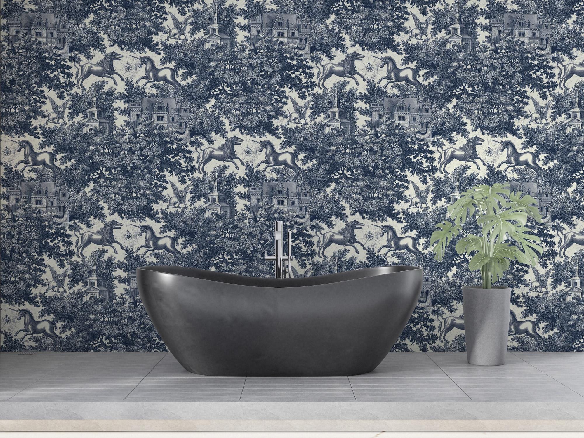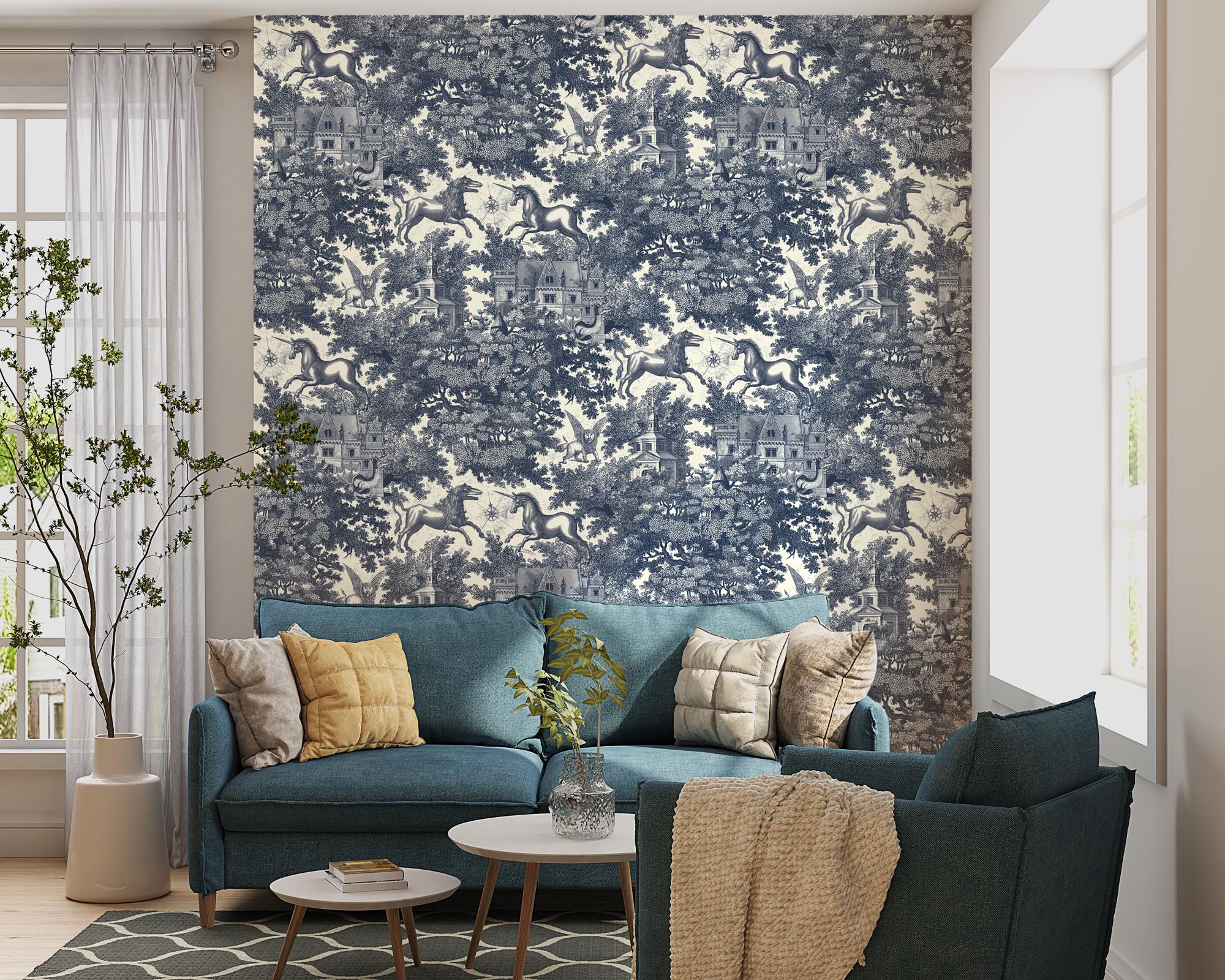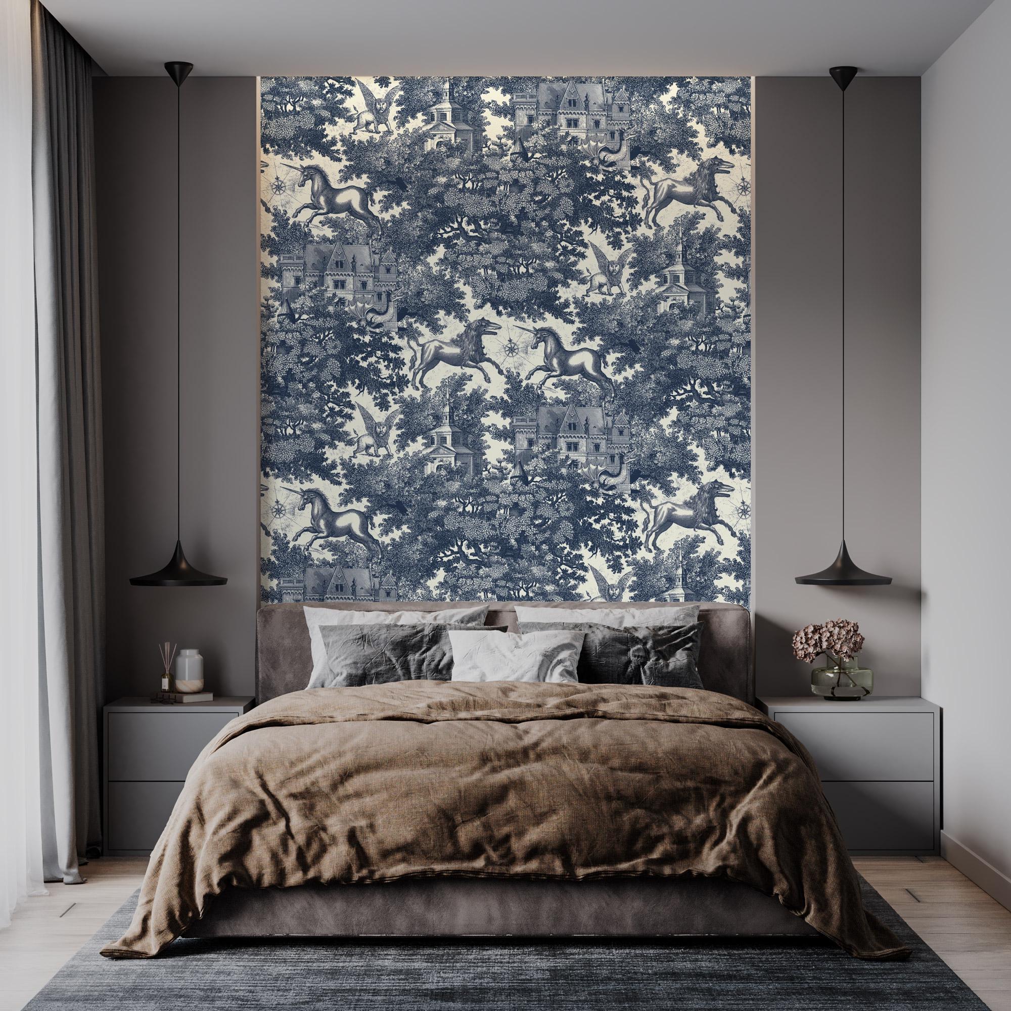 Vintage Blue Toile Fantasy Wallpaper - Unicorns and Dragons Mythical Creature Castle Mural