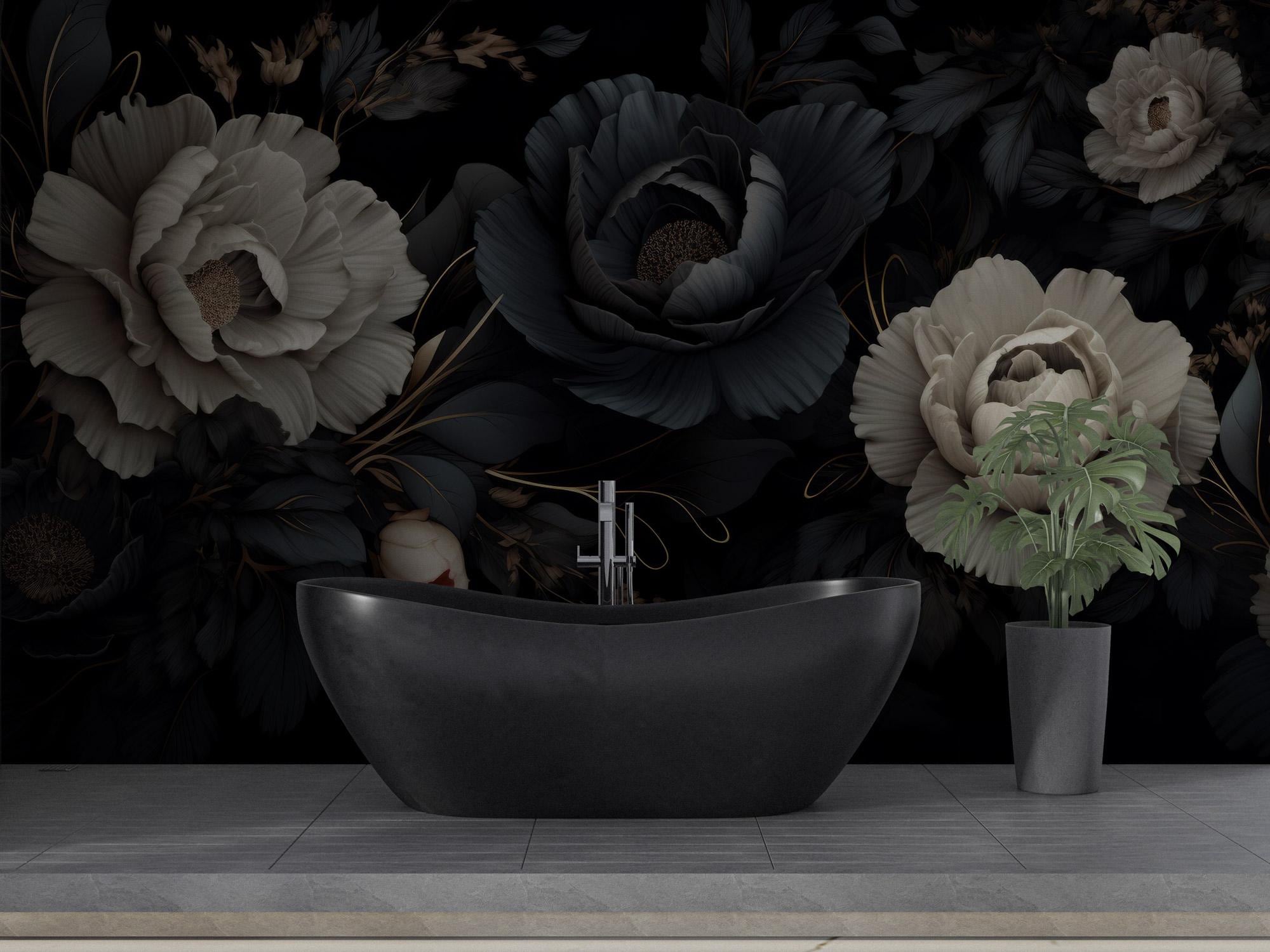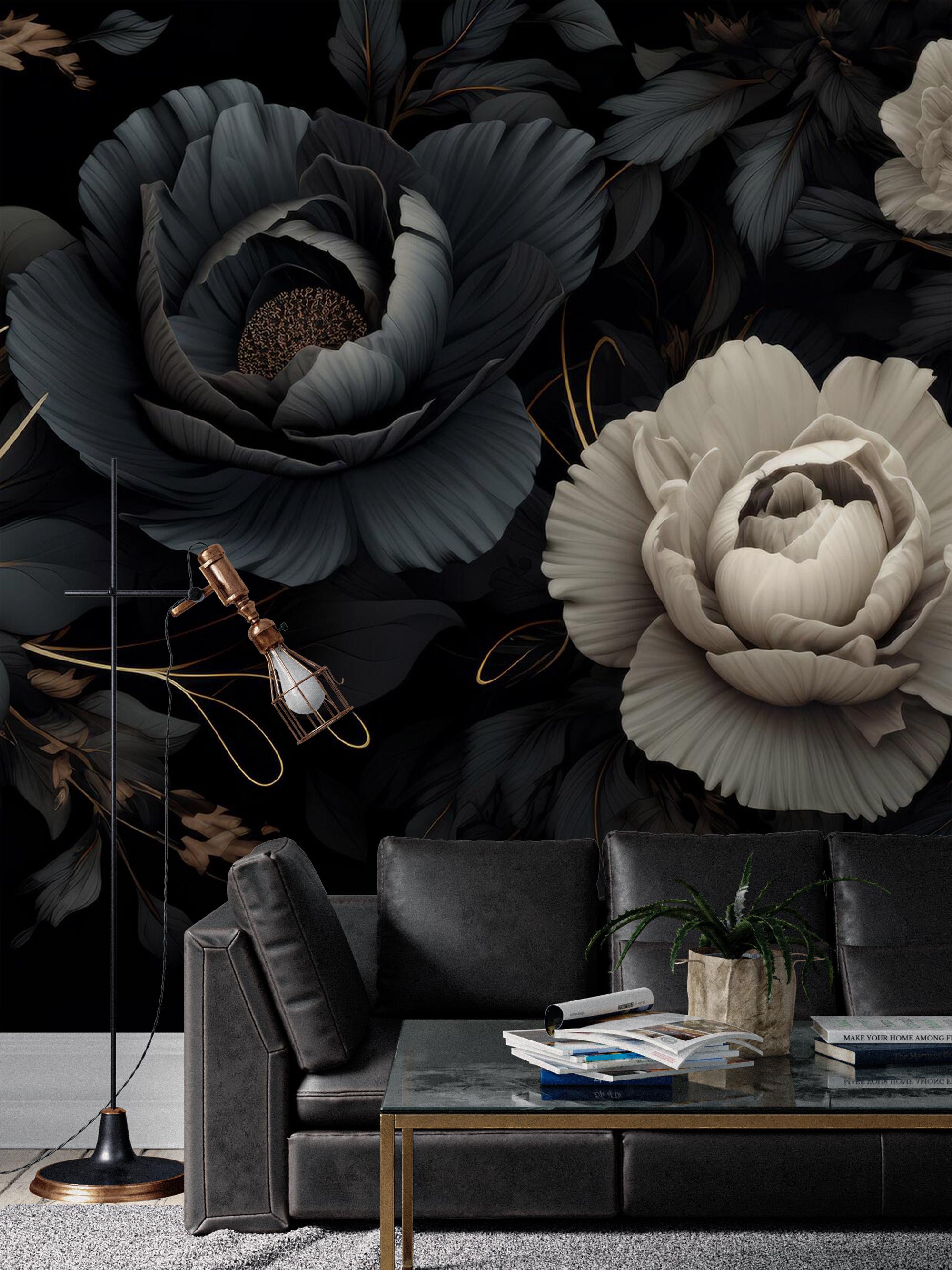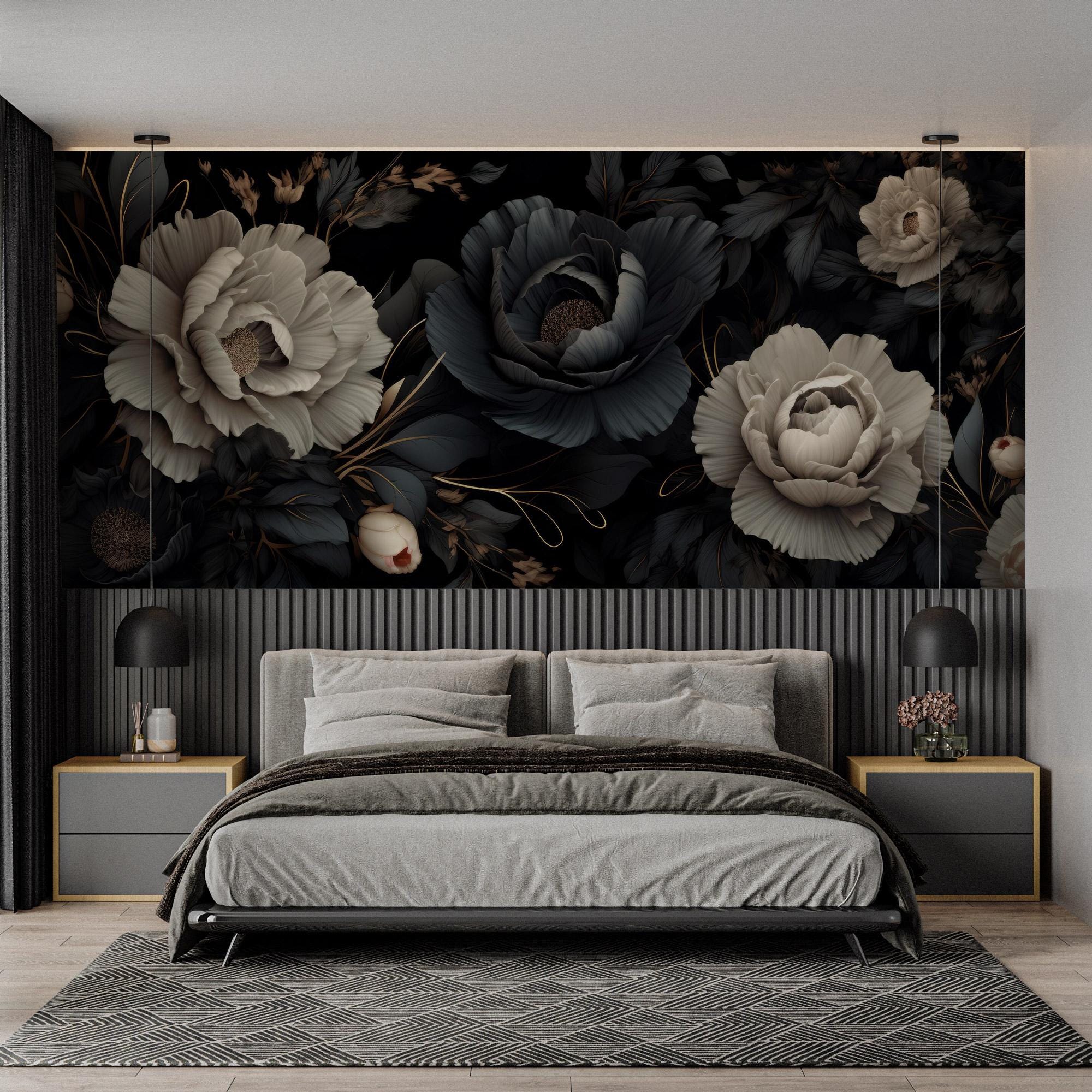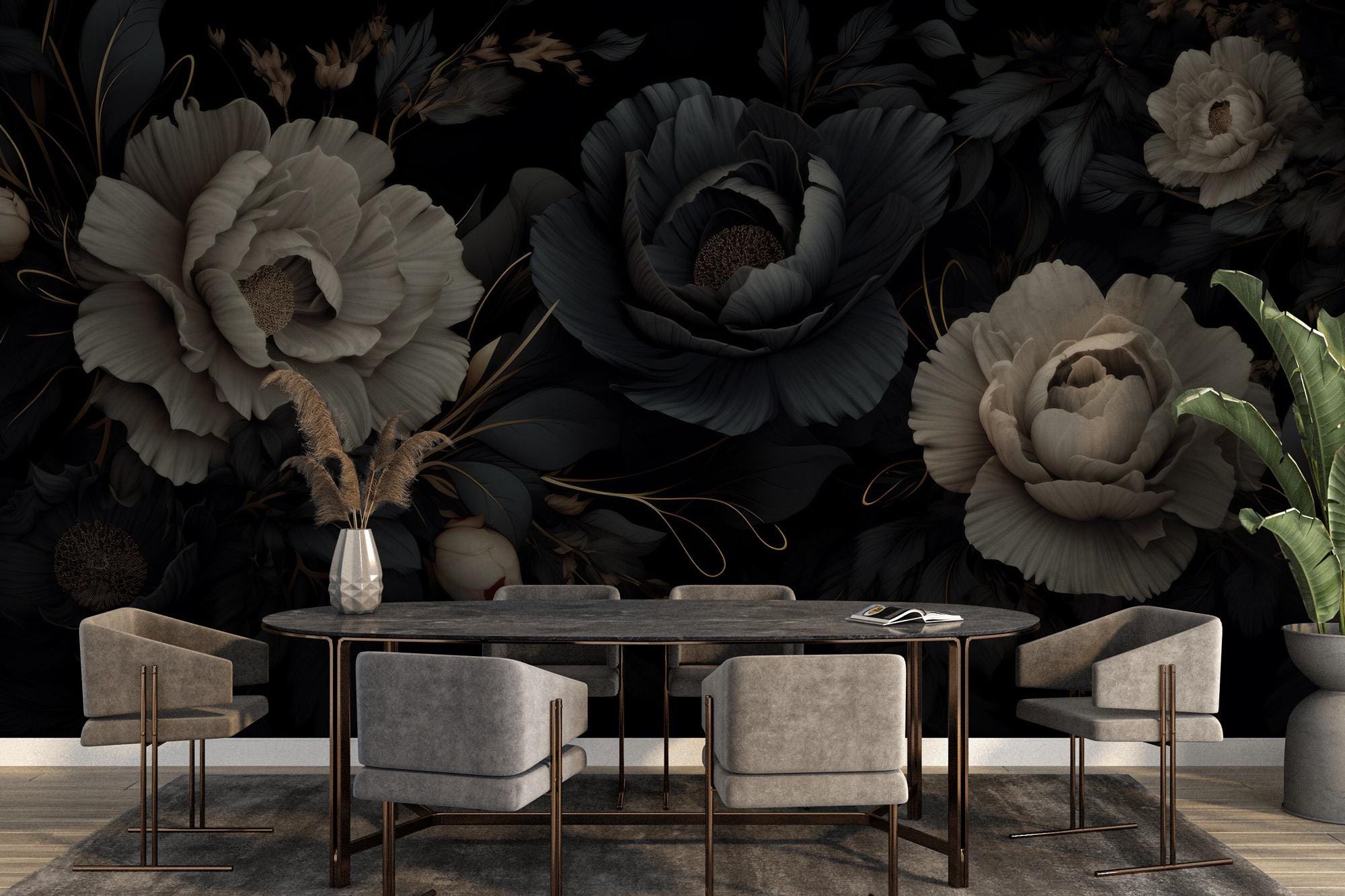 Dark Floral Wallpaper - Oversized Beige Black Peonies With Golden Traditional and Peel & Stick Wall Mural