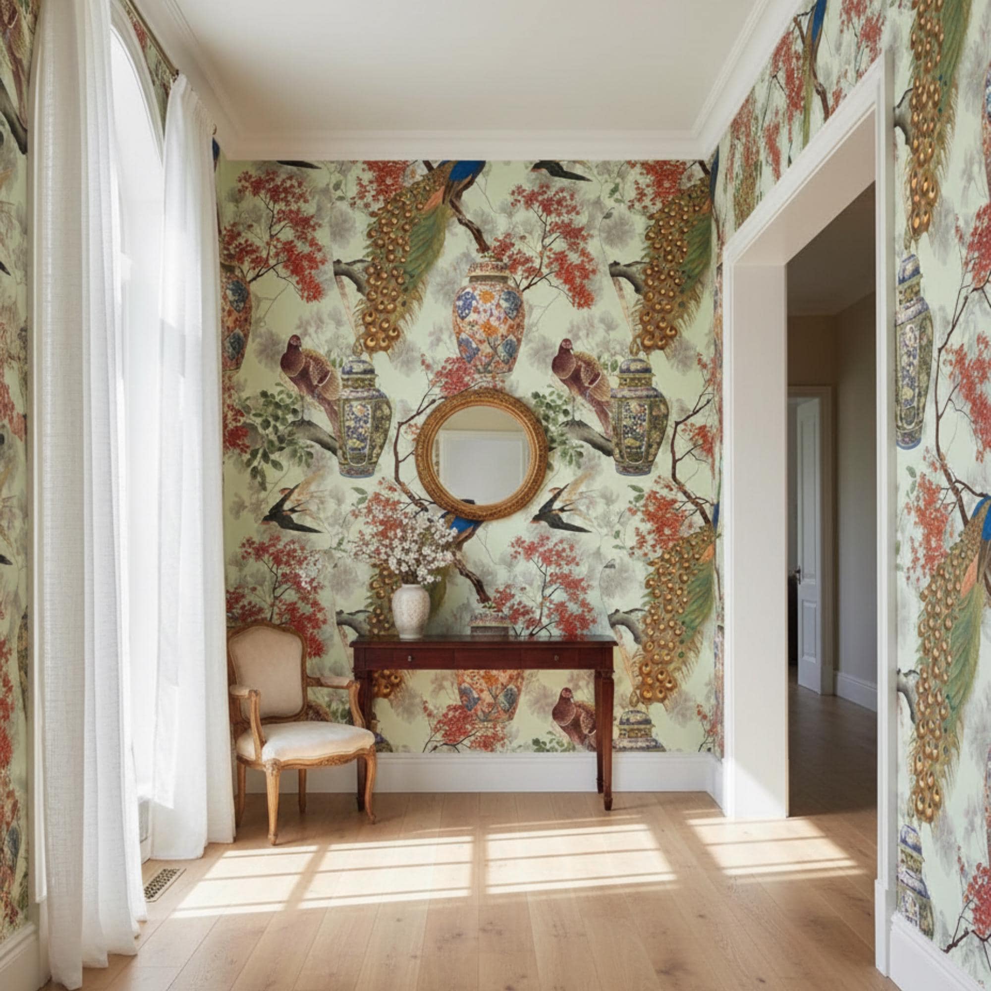 Chinoiserie Peacock Wallpaper - The Elegance of a Quiet Garden, Oriental Vases and Red Maple Branches Wallpaper