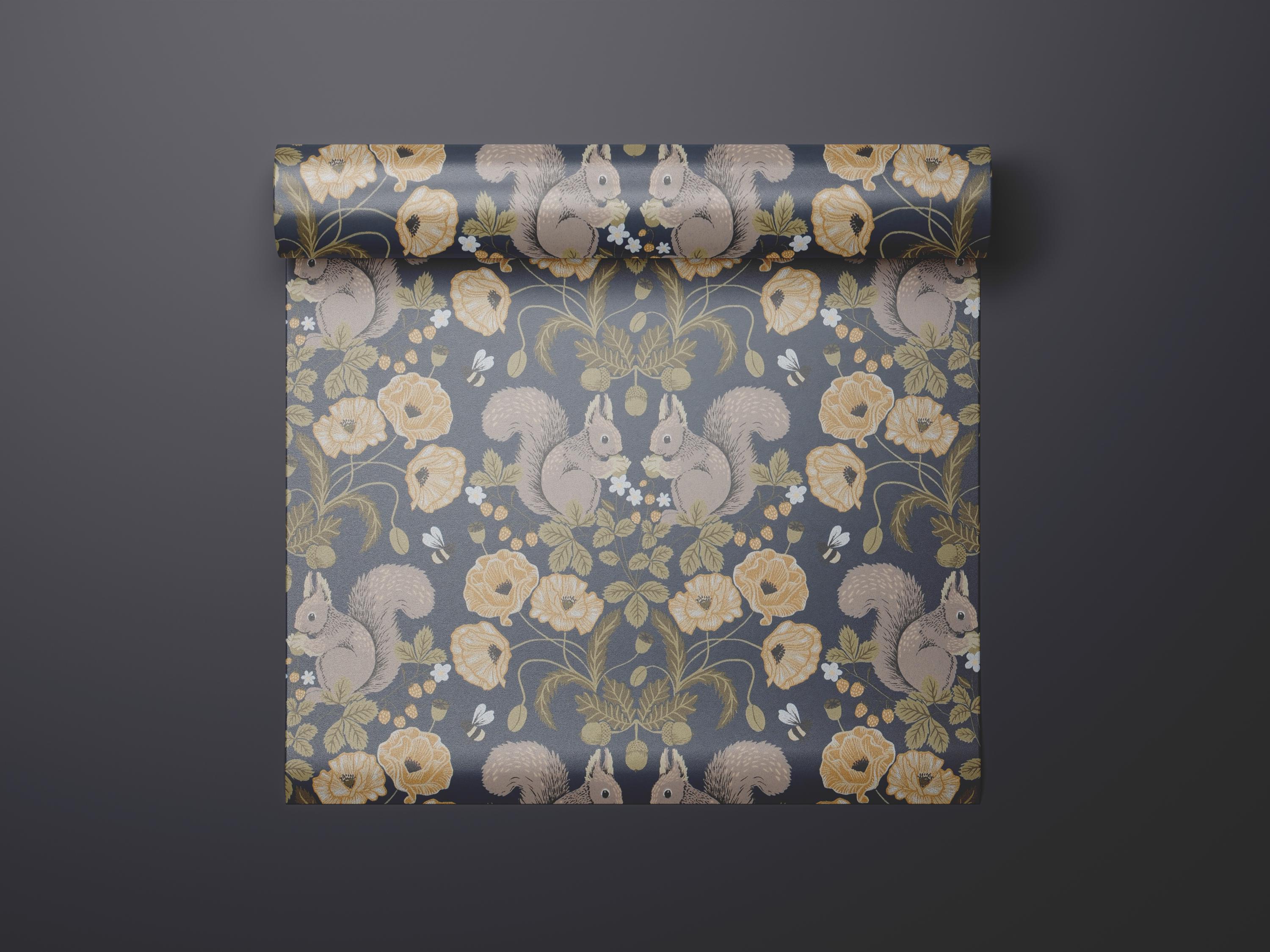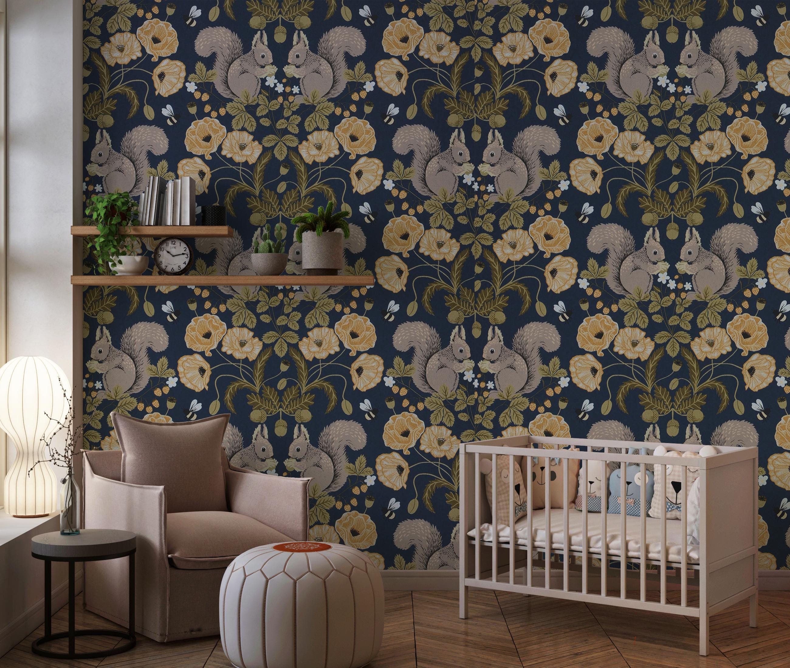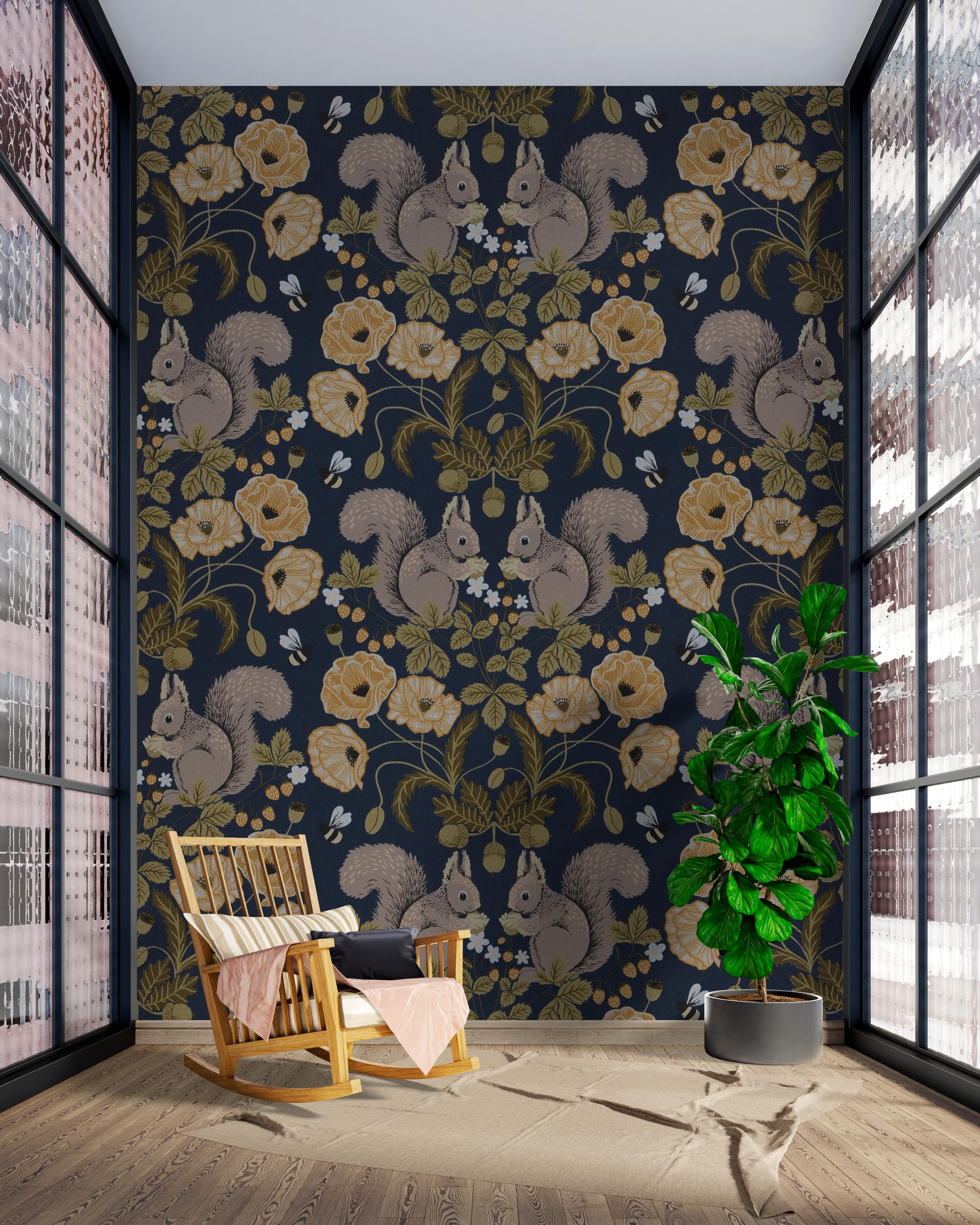 Dark Blue Squirrel Floral Wallpaper - Woodland Animals & Botanical Pattern