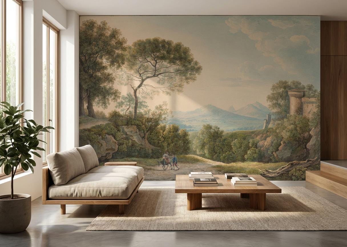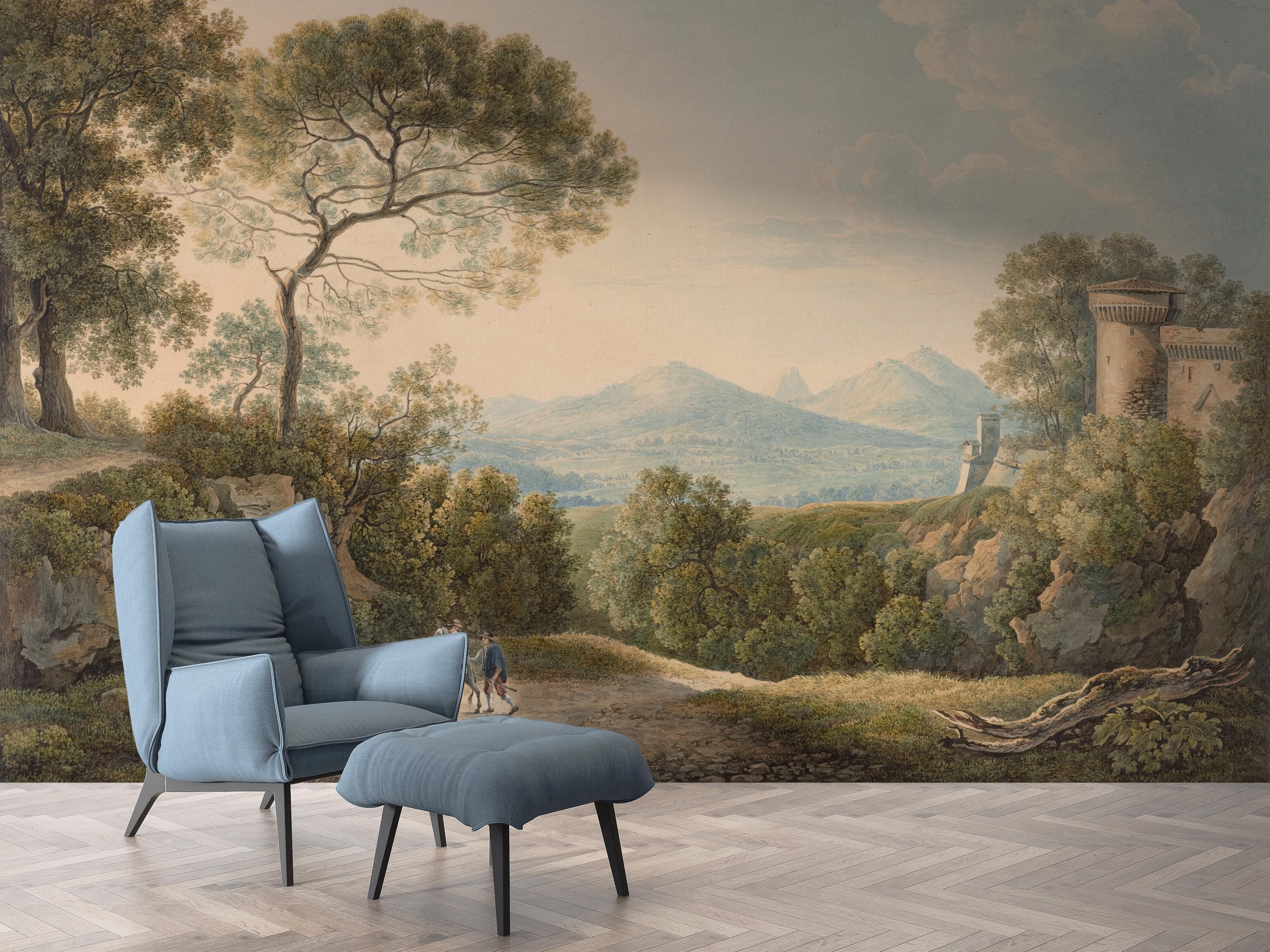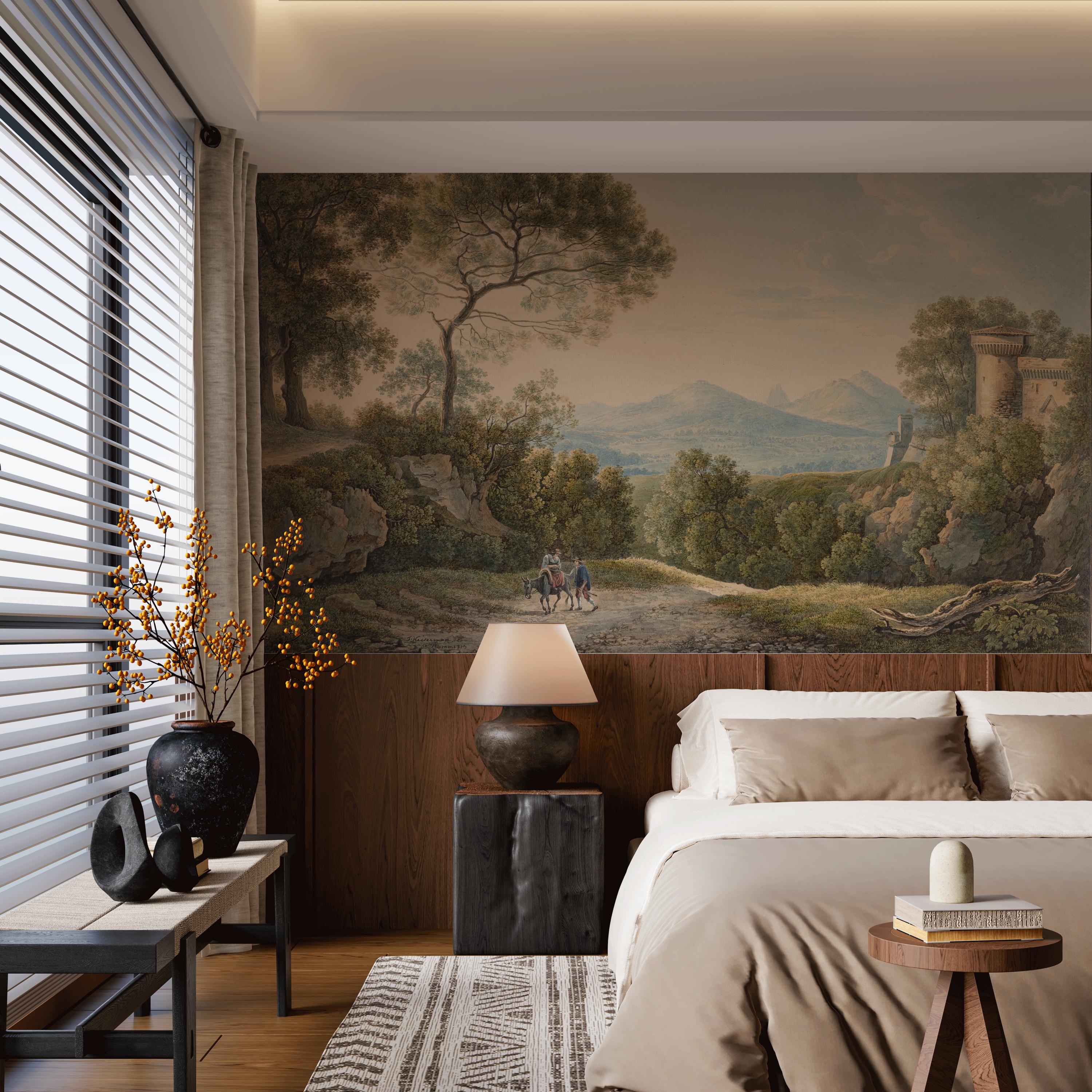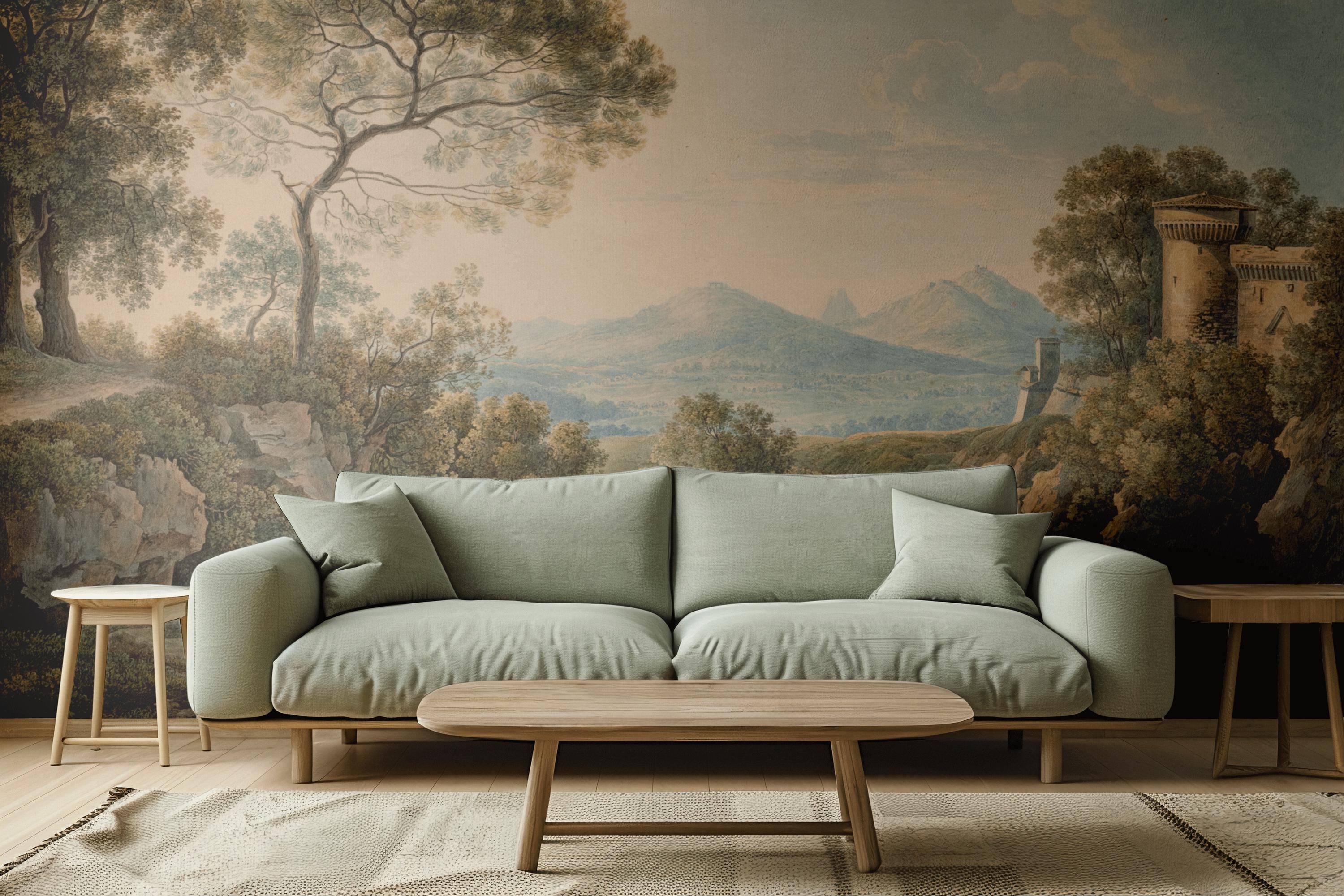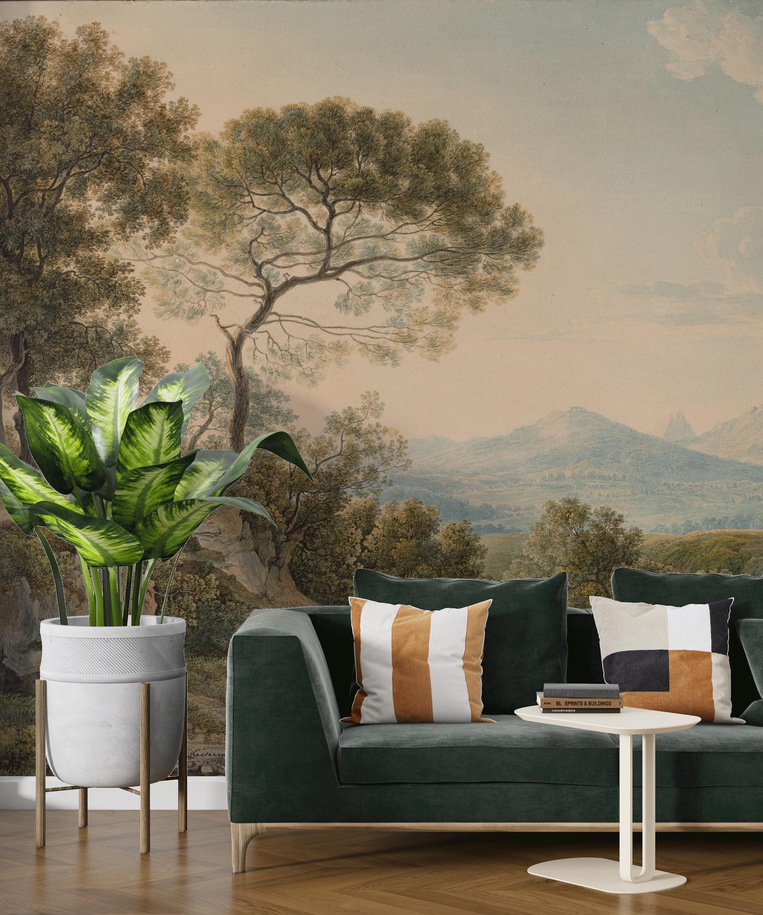 Vintage Sunset Landscape Wallpaper - Tiber Valley Scenic Countryside Peel and Stick Wall Mural
