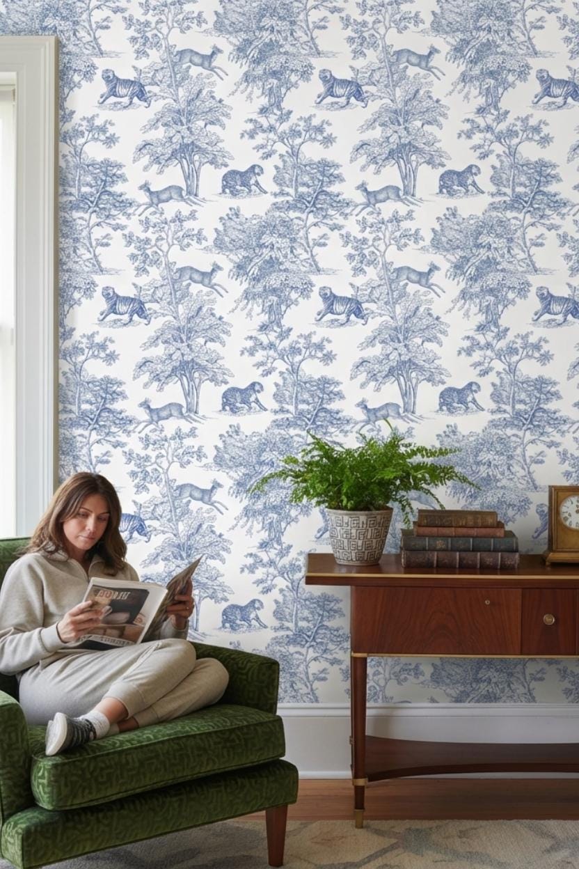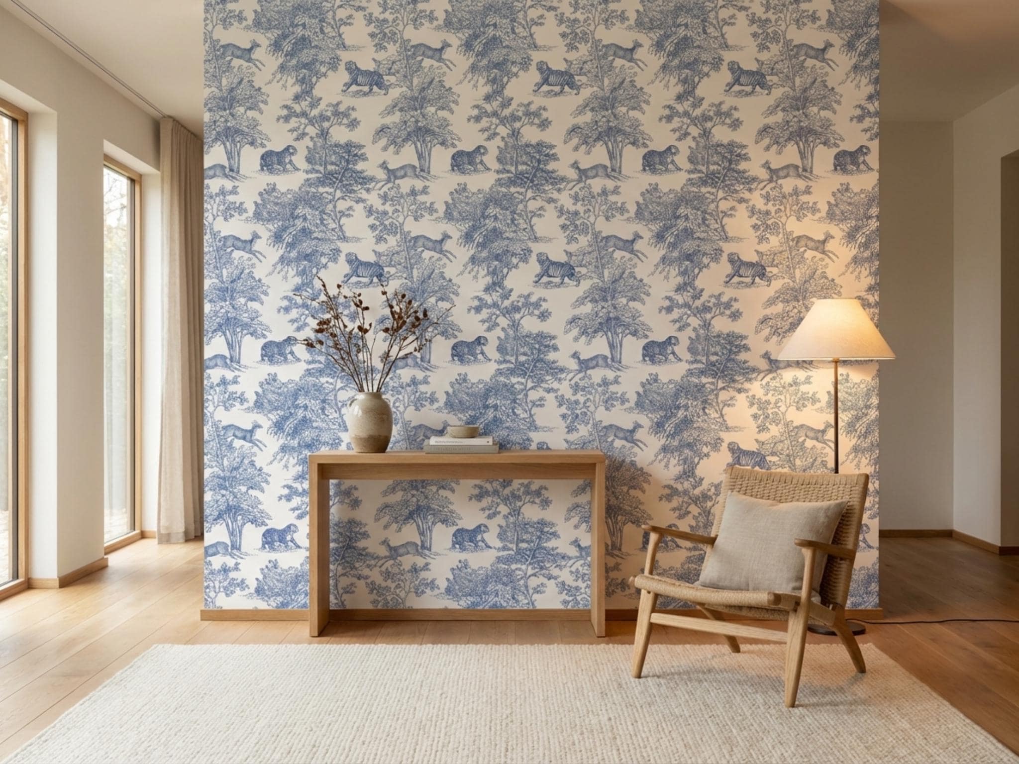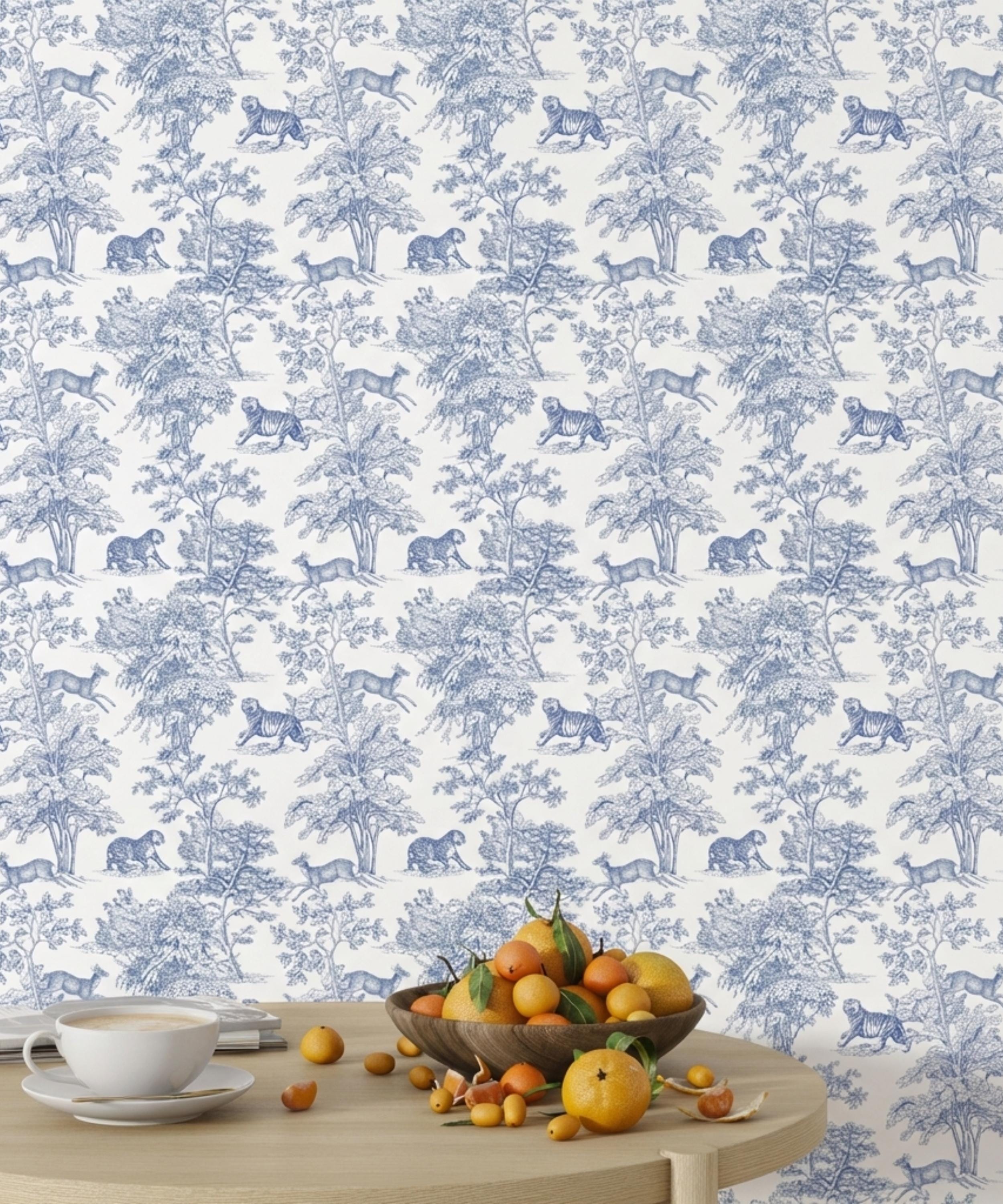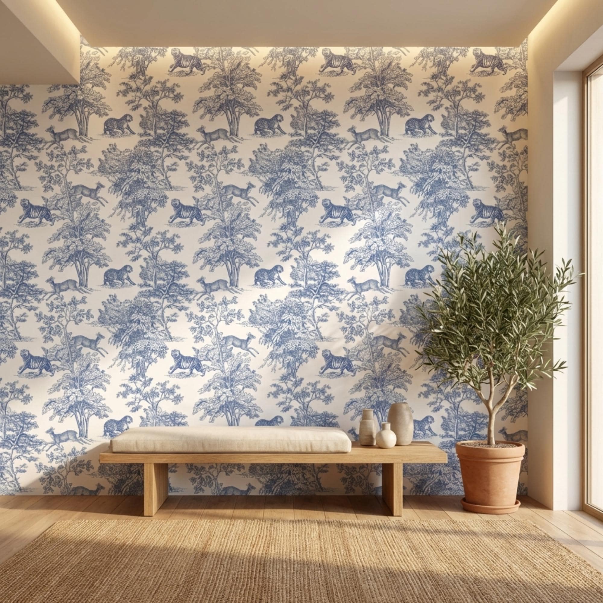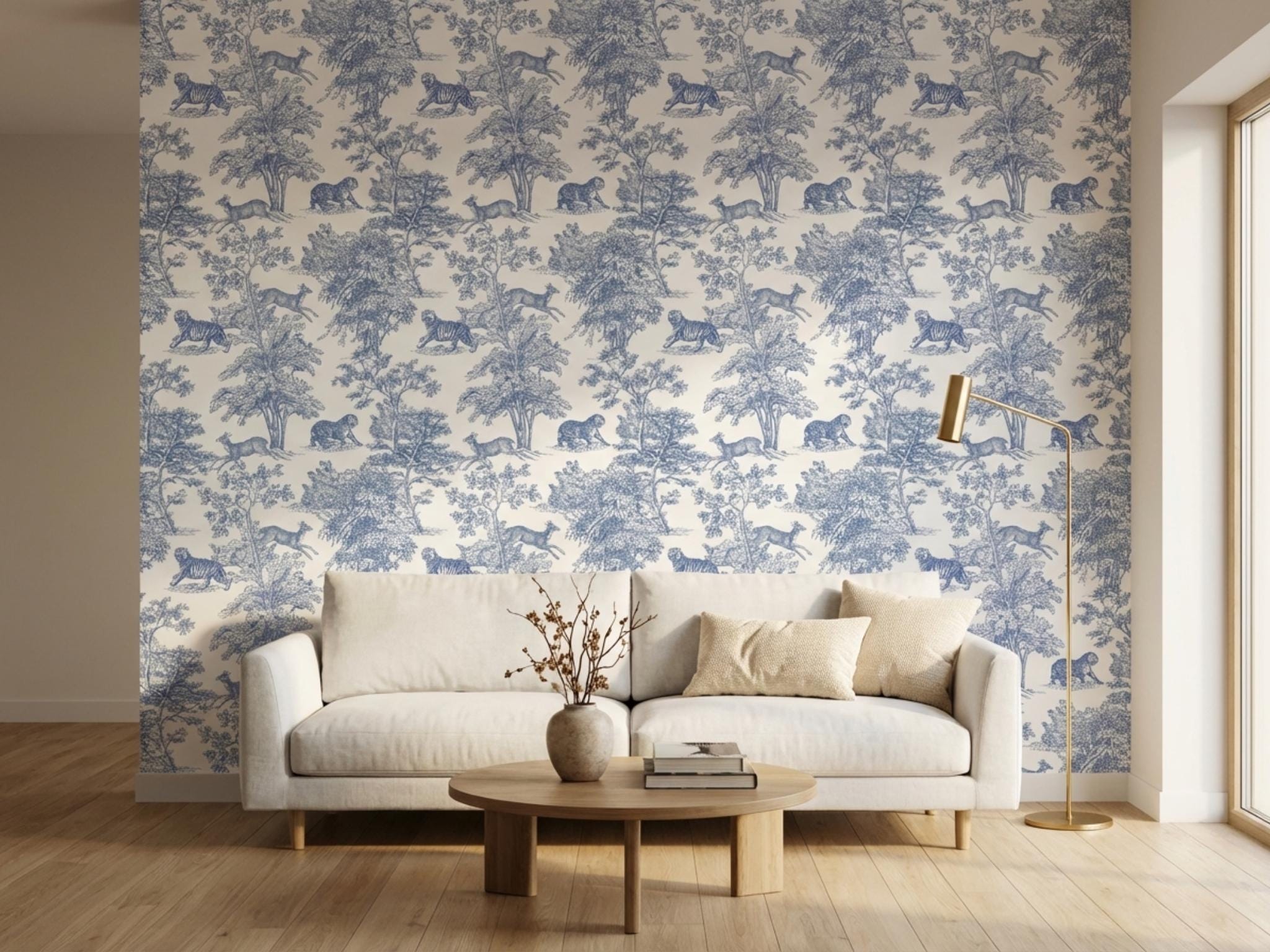 Blue Deer and Tiger Wallpaper - French Toile de Jouy Peel and Stick Wall Mural