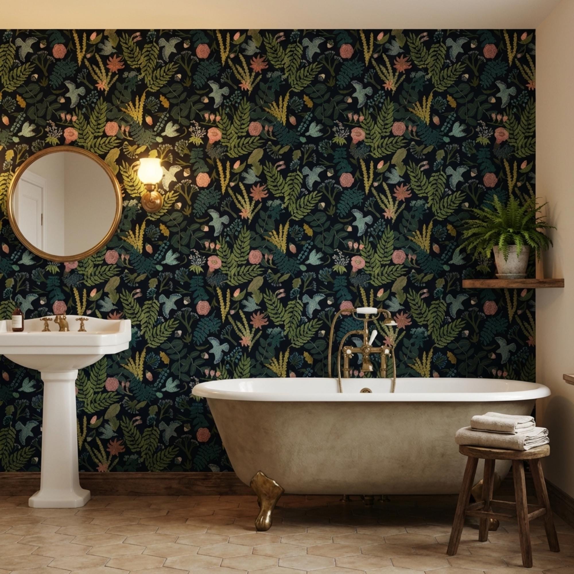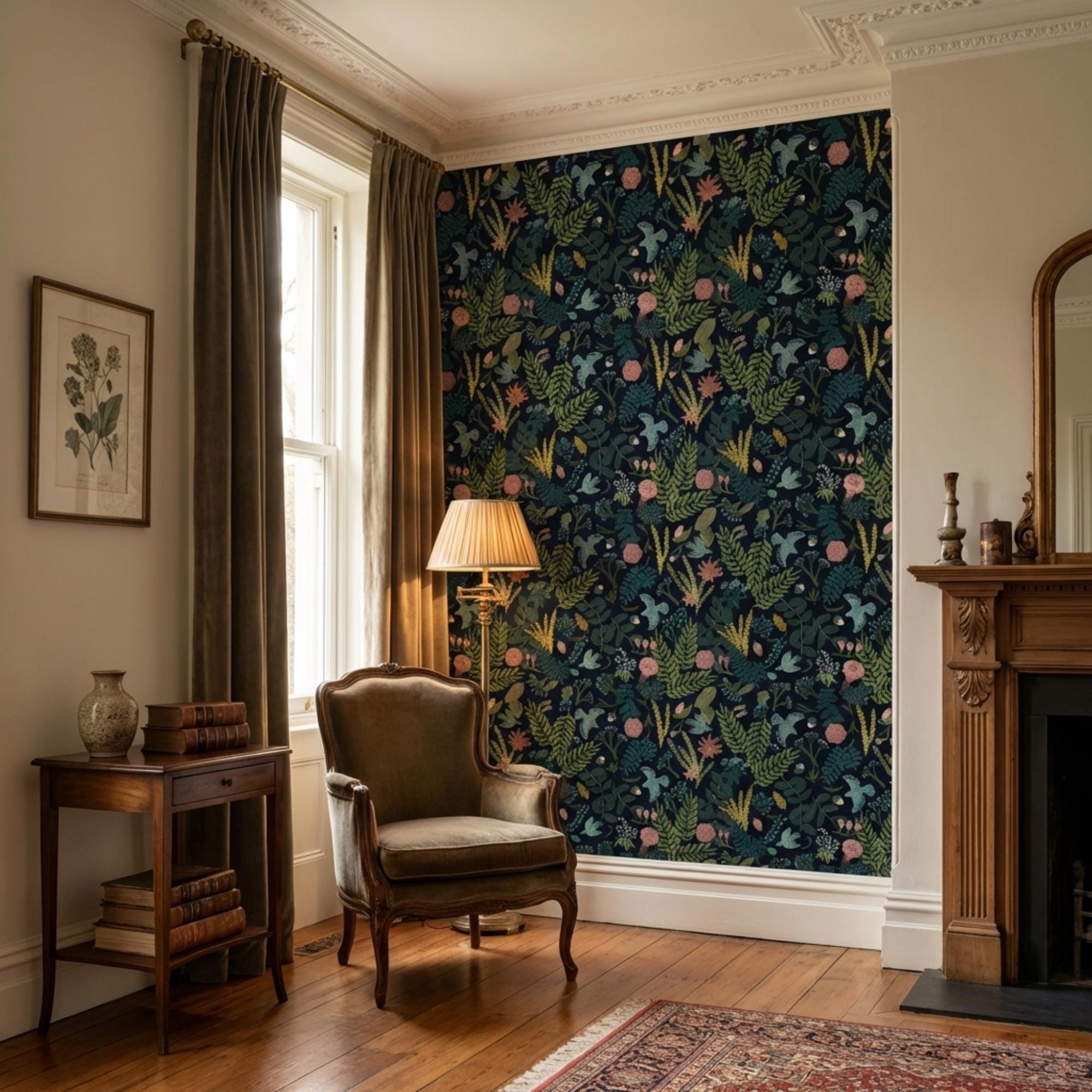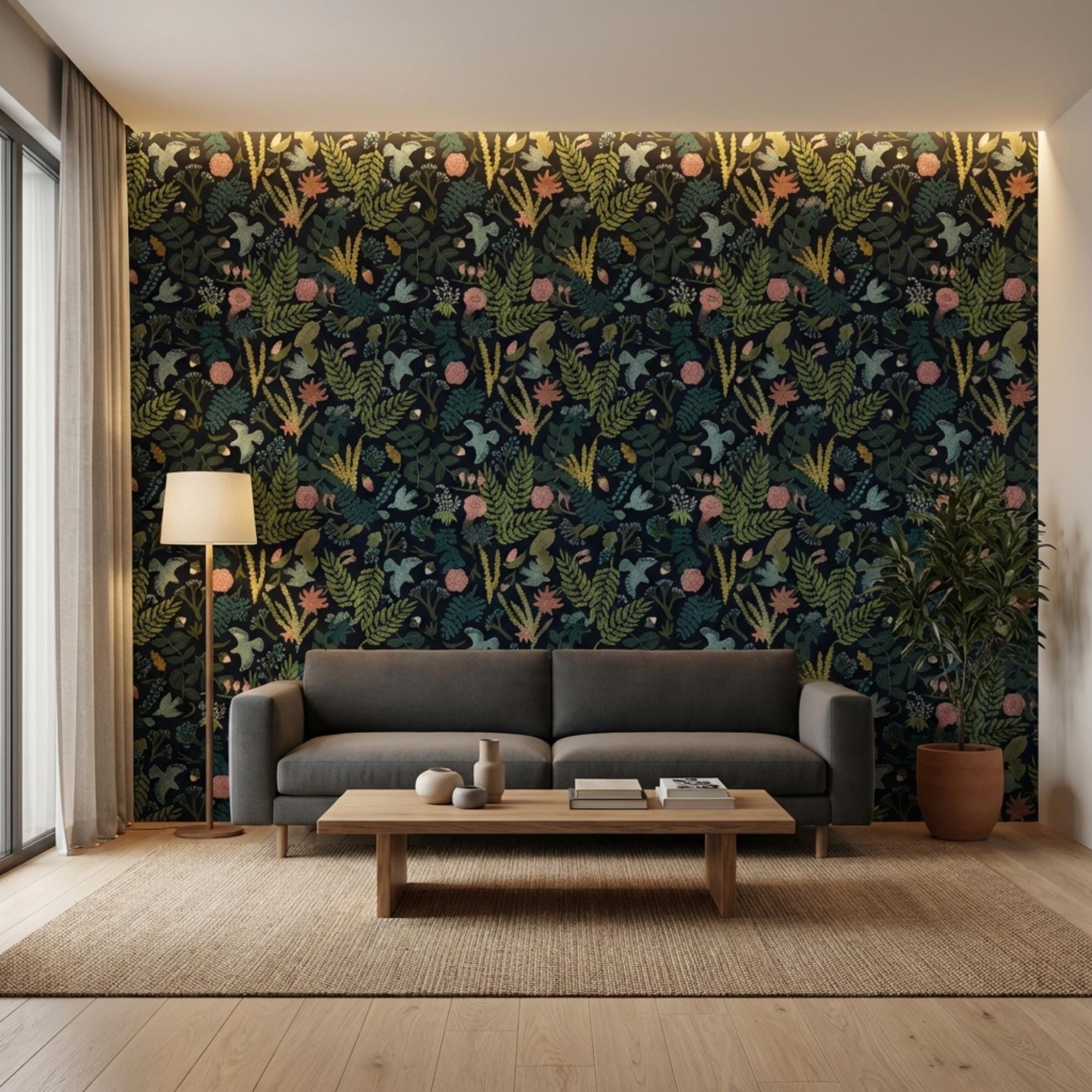 Dark Floral Bird Wallpaper - Vintage Botanical Moody Nature Wall Art