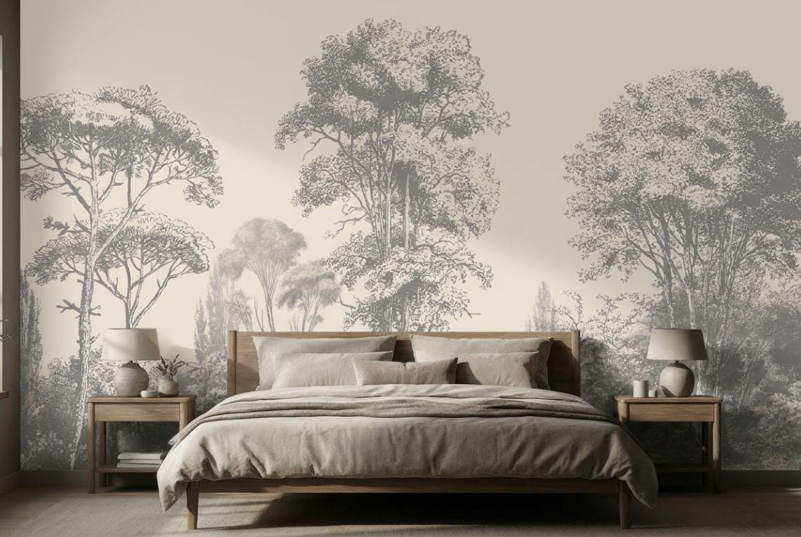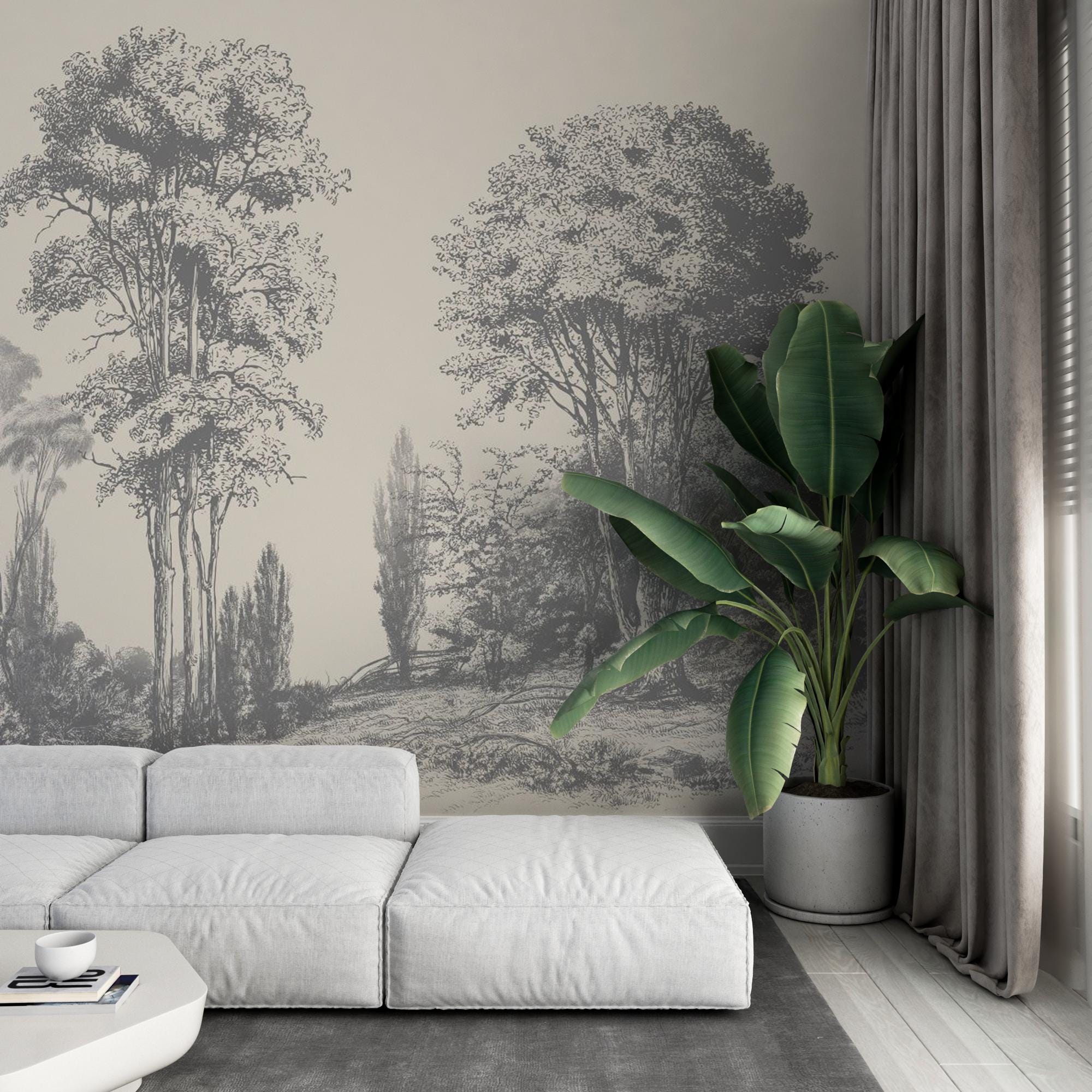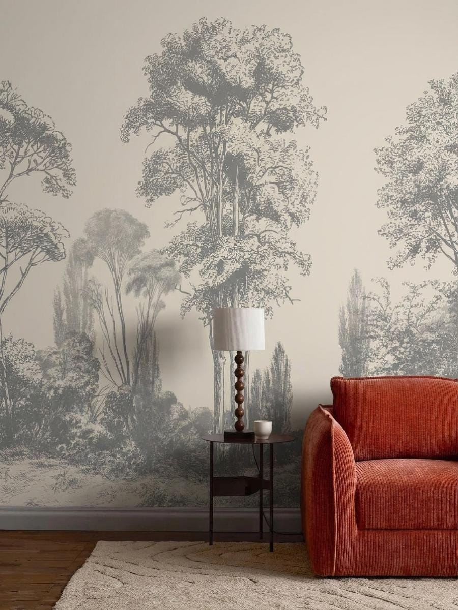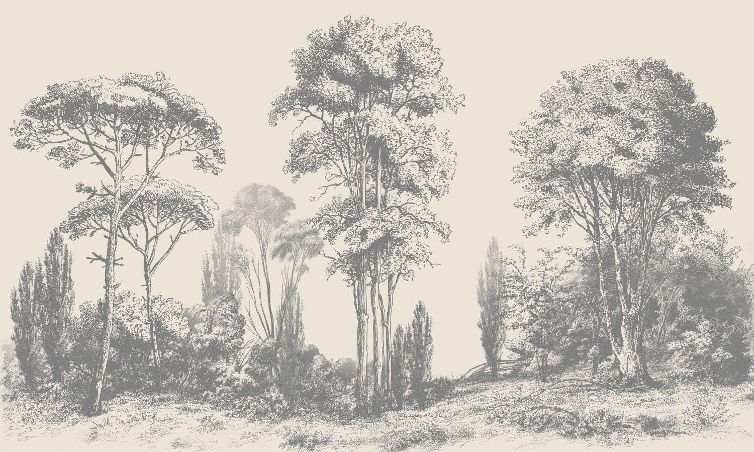 Vintage Tree Landscape Wallpaper - Hand Drawn Forest Peel and Stick Wall Mural