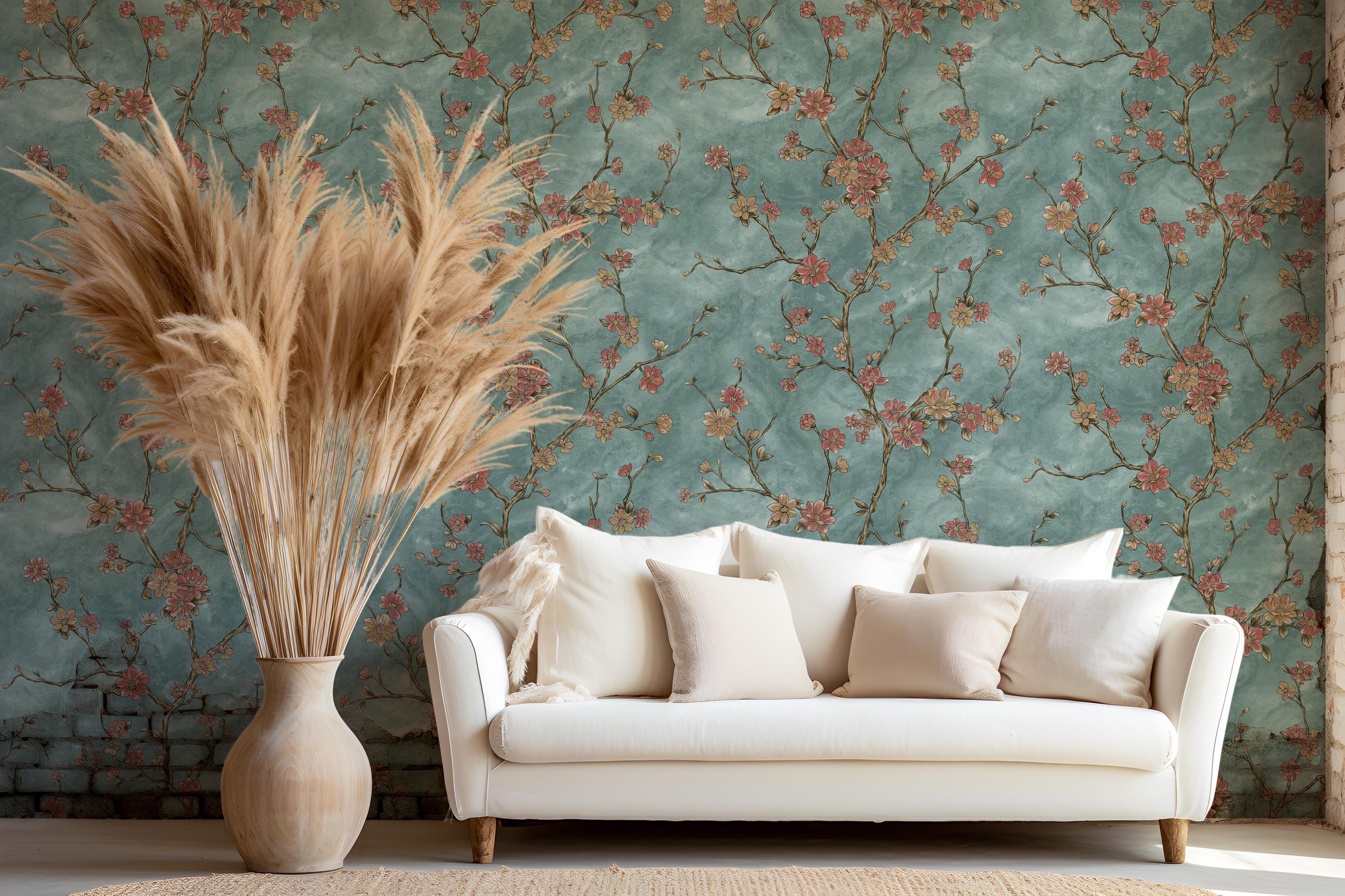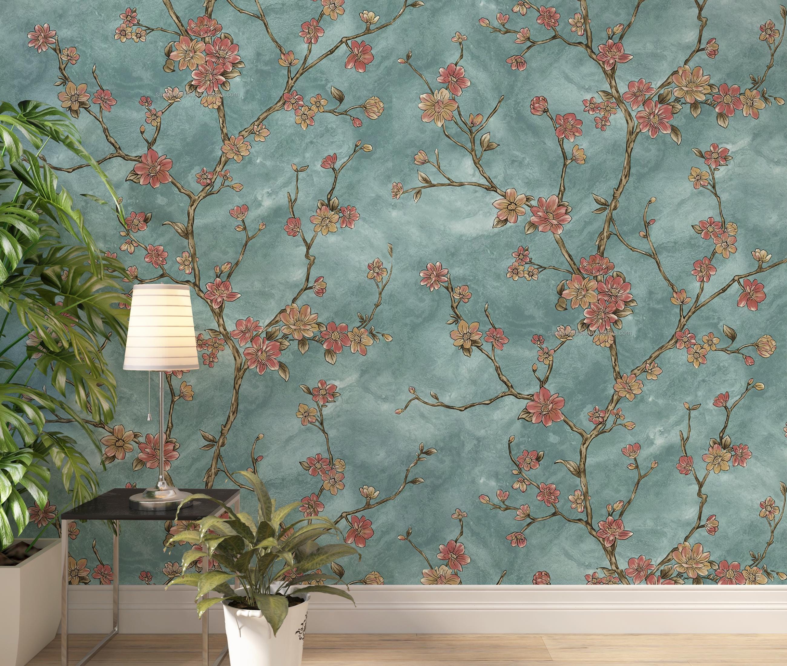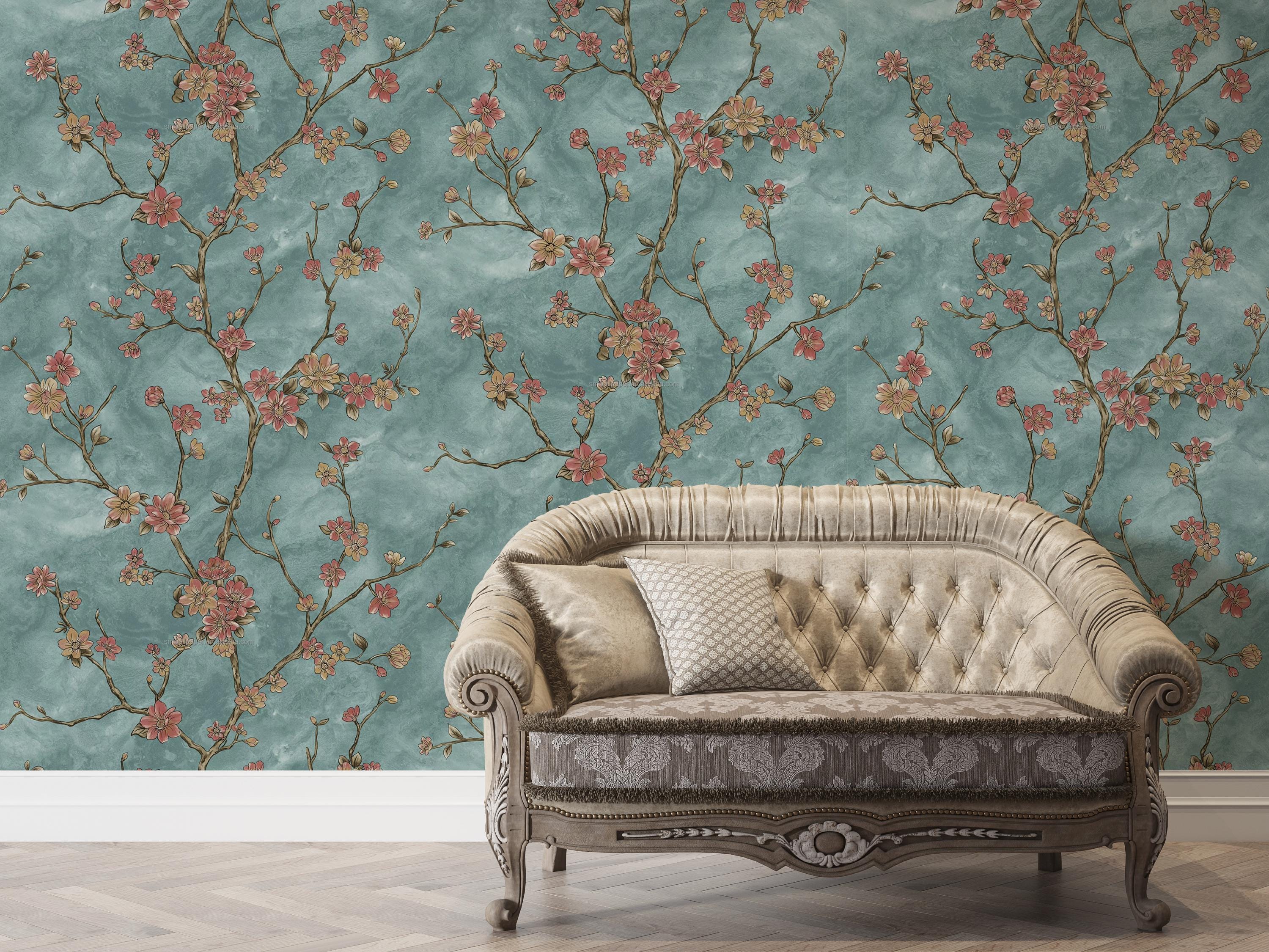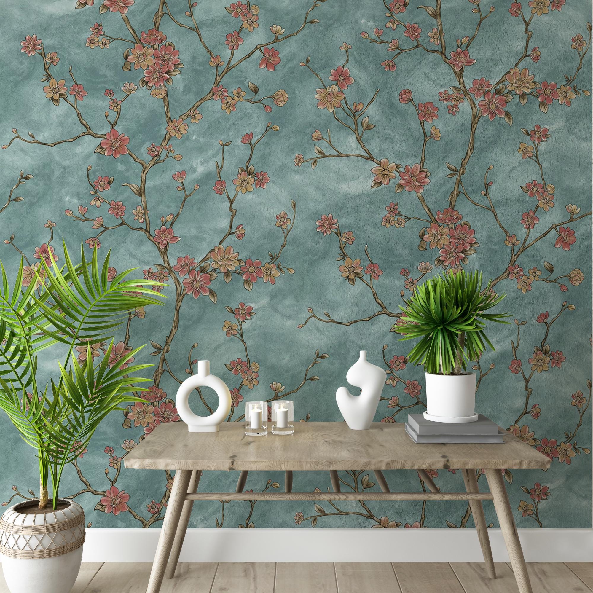 Cherry Blossom Branch Wallpaper | Asian Botanical Chinoiserie Peel and Stick Wall Mural
